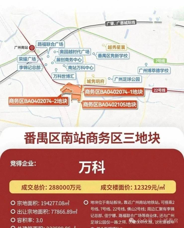 万科以底价28.8亿拿下广州南站商务区三宗宅地,总面积约23万㎡,折合楼面价约1.1-1.3万/㎡,铺开了南站3.0时代新的深度求索。