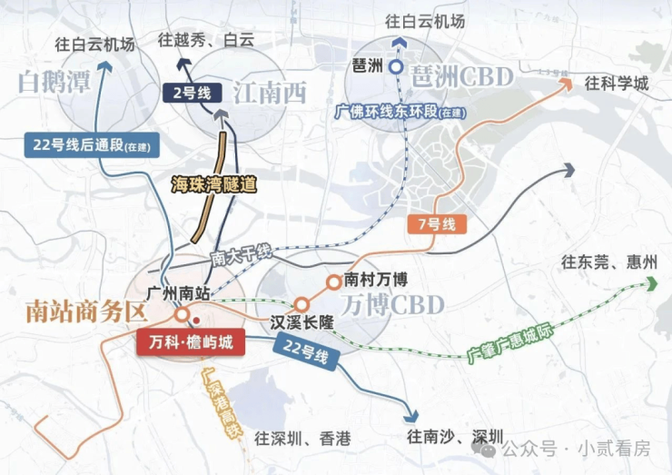 万科檐屿城距离广州南站直线距离1.5km,22号线、2号线、7号线、佛山2号线在此交汇,4站可达万博、海珠,6站达珠江新城。