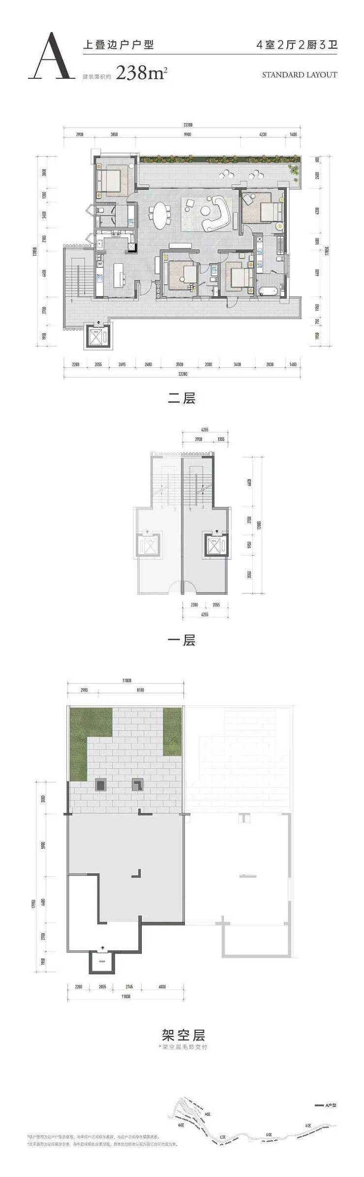 相比于下叠,上叠进一步发挥想象,虽然仅 建面约 172㎡ ,但依然 保留客餐厅区域的阔尺空间等优点。