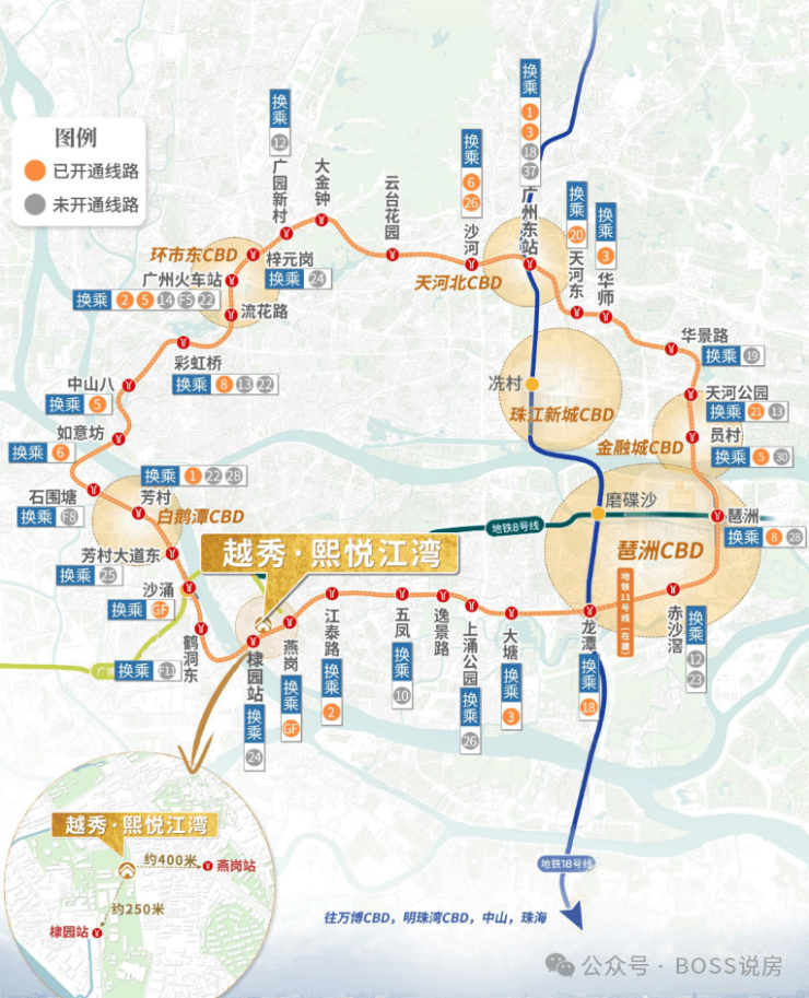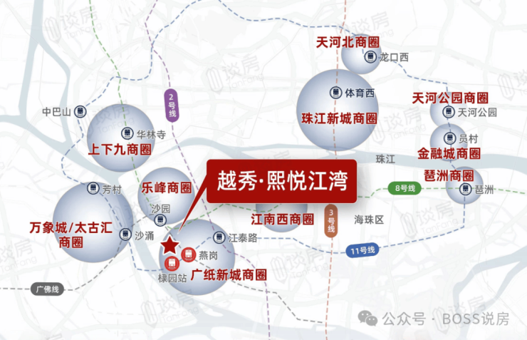 地铁:距离广佛线燕岗站B口约 400 米,广州地铁 11 号线棣园站约 250 米,7 站可达南站,7 站可达琶洲,可快速连接全城,虹吸广佛优质资源