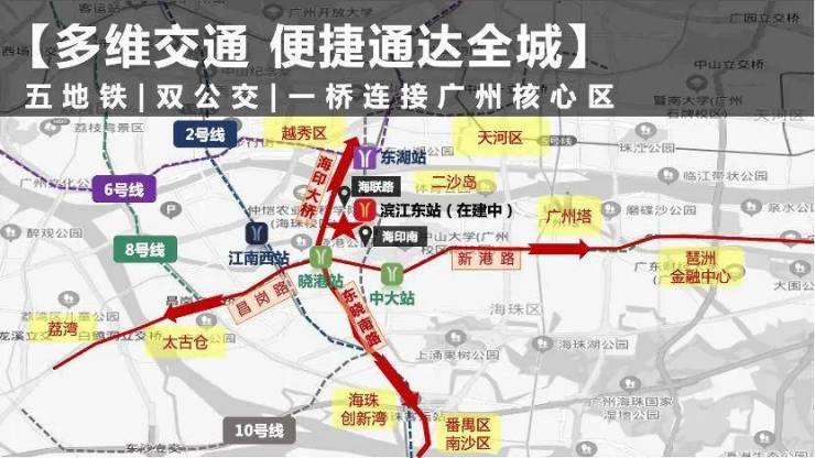 四:【多维交通】—“三纵五横路网”,东晓路是海珠形象主干道,一路通途搭琶洲、珠江新城、二沙岛、老东山极为便利,外驳多条公交线路快速通达各区各处。2023 年止更将覆盖有5地铁环绕本项目周边,咫尺即达“滨江东地铁站”无往不利。