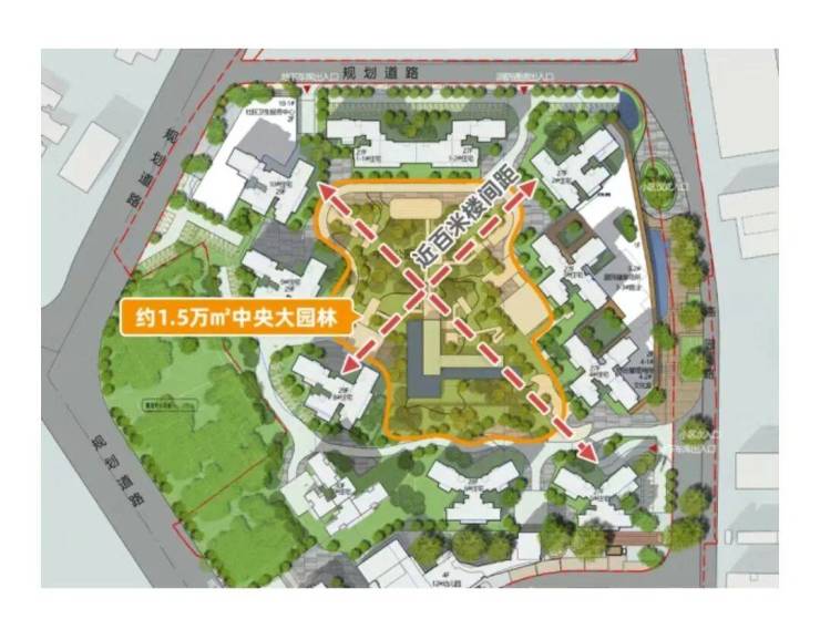 整个采用围合式布局,拥有近百米楼间距,把充足的空间,留给园林、绿地,打造一座城市中轴之上,罕见的建面约1.5万㎡中央大园林。