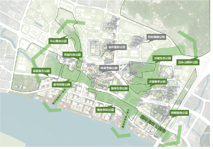 结合本土文化内涵塑造9个特色主题公园:海丝科技公园、都市农田公园、岭南艺境公园、沙浦国学公园、城市塑影公园、缤纷童趣公园、龙舟生态公园、远洋文化公园、桥畔运动公园。