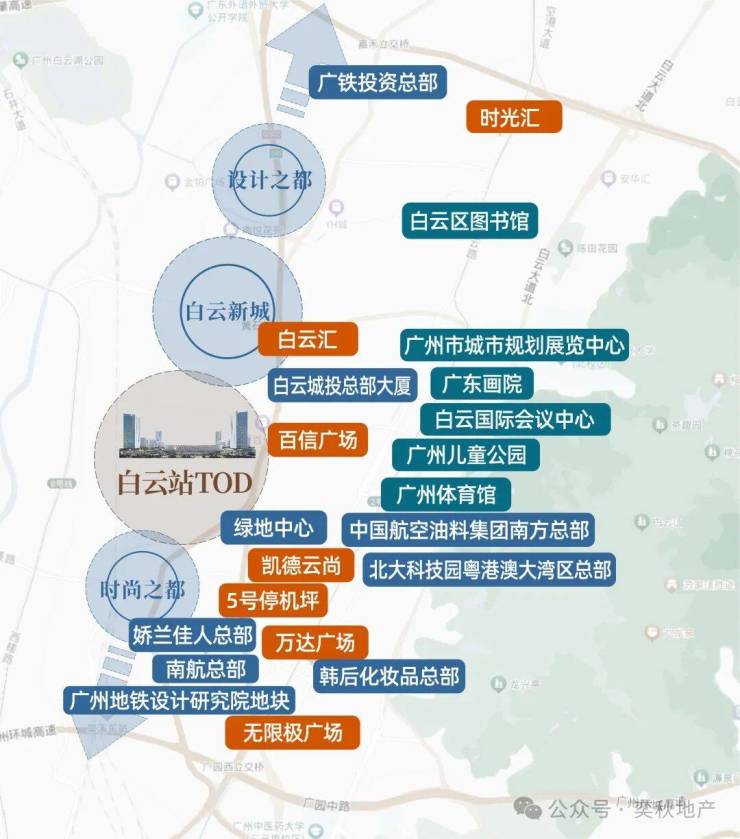 白云站TOD粤胜广场5公里范围内,聚集了超170个重点项目落户,20多栋总部大楼拔地而起,已有140家企业进驻,周围环绕6大地标!