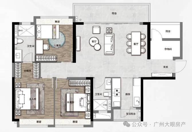 超6m超宽景观阳台,享大夫山湖头排景观; 全屋飘窗面积全赠送,双阳台面积半赠送,实用率超80%