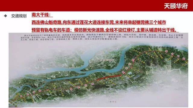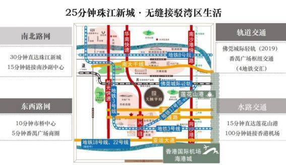 2.“水路轨”三维立体交通:“五纵三横”路网交通 20 分钟直达广州 CBD, 15 分钟广州南站,毗邻地铁三号线始发站番禺广场,穗莞深城际轻轨,莲花山港 90 分钟链接香港。