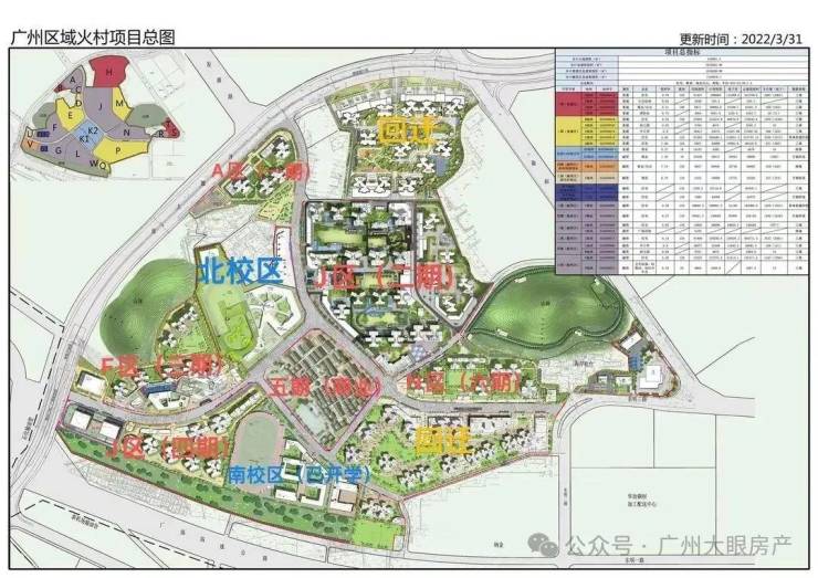 一期A区,二期J区,三期F区,四期G区,六期N区,五期是花厅坊古村落商业街,H区、M区、P区、Q区为回迁房