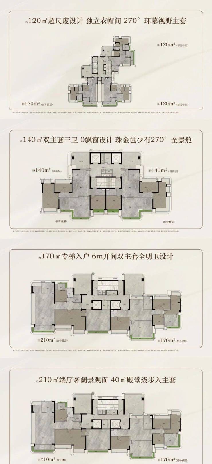 【产品配置】北区2T3/3T4塔楼,南区2T2板楼,建面约120-140-170-210㎡云幕平层