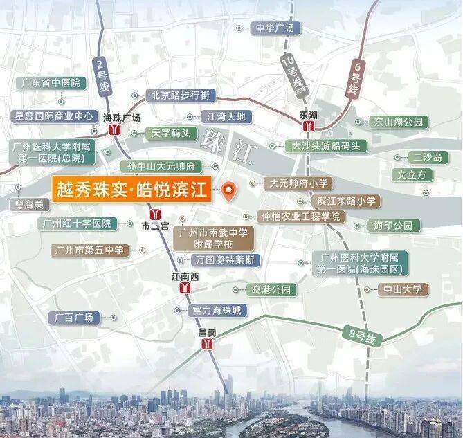 项目其实不是很近地铁站,最近2号线市二宫站步行距离大约1.2公里,有点不上不下的距离,最好是电动车需要接驳,一站江南西/海珠广场,2站昌岗/公元前,东侧还有10号线滨江东站也已经开通了