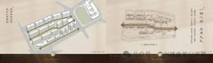 ①【板式楼栋】2.93低密府院大宅,一字板式楼栋布局,户户朝南,风光俱佳。一轴入府,以礼制中轴对称规制院落布局,尽显府院的东方美学