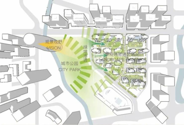 把小区西侧的城市公园视野引入社区,打造内院、外园的无界绿色视觉。