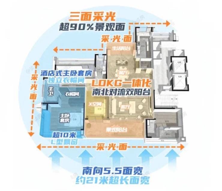 全屋南向5.5开间,约9.3米长IMAX景观阳台