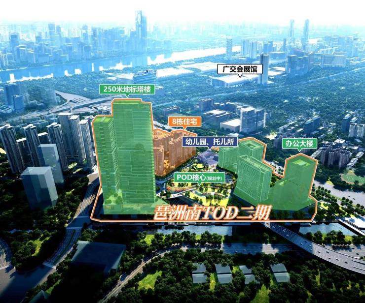首先,琶洲南TOD二期的规划中囊括了办公楼,将承担整个琶洲南TOD的高端商务功能,其中就包括高达250米的琶洲新地标。