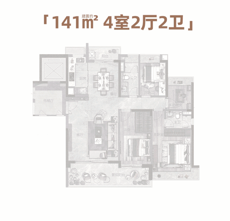 141平方米四房:客餐厅一体化设计,连接南北超大双阳台,动静分离,保障私密性,总价约为600万左右。