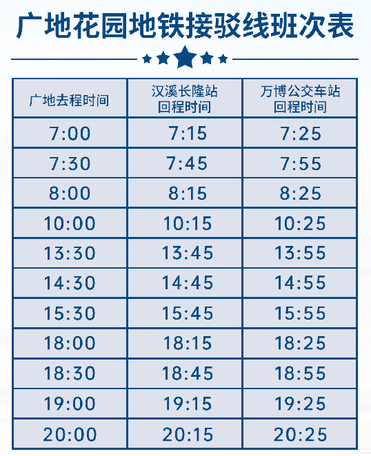也有专线接驳地铁南村万博站(7分钟)和汉溪长隆站(10分钟),可乘坐地铁3-7-18号线。