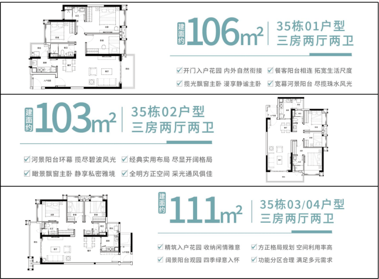 此次广地花园·观灏,面积段80-107悦景三房,多面采景,三面望水,通透采光,充分利用户型的每一寸肌理,以有限的生活空间焕发更多生活灵感,打造全方位人性化居所。