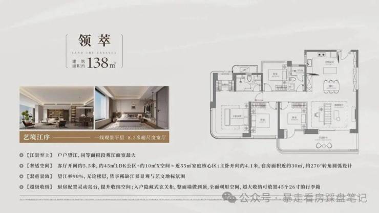 PART 05 奢艺环幕景观台新规产品涵盖128/138/183/238㎡,拥有超100%的使用率,匠心设计,确保极致的江景视野超100%实用率,户户270°转角窗,全广角瞰江视野,境藏滨江质感生活。
