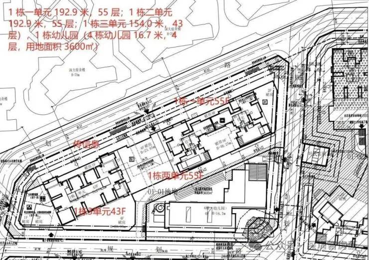 01地块规划总建面约17万㎡(住宅建面约8.9万㎡,商业建面约3.2万),容积率达9.0。由2栋(1栋1、2单元)53层、1栋(1栋3单元)43层的超高层塔楼和1栋幼儿园组成。