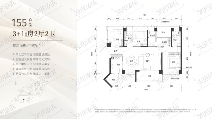 152㎡的4房2厅2卫,3栋2单元01户型,设计的是横厅南北通透格局,进门入户玄关,客餐厅7.7米开间,LDKB一体化设计,四开间朝南,4个卧室分别做到了主卧21.17㎡/次卧12.4㎡/次卧11.7㎡/次卧11.7㎡(包含墙体飘窗),客厅出5.1米长阳台,L型厨房带1个生活阳台,公卫三段式分离,得房率约90%(包含赠送),东南朝向。