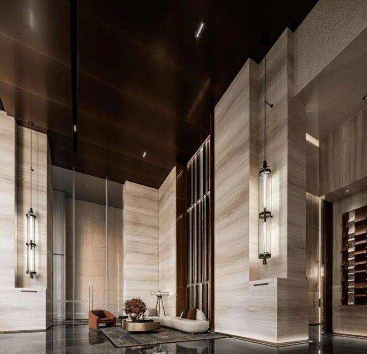 约9米高朗阔入户大堂,汲取明阔开朗的岭南建筑气质,奢雅的仿古铜色大门之外,立面色调以浅色石材中性色为主,摒弃多余而浮夸的修饰,将广府气韵浓缩其中,整体呈现出古今相宜的尊贵,兼顾艺术感与审美细节。