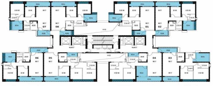 项目住宅为南北对流布局,四梯八户,每两条电梯负责四户业主的上落,互不干扰。