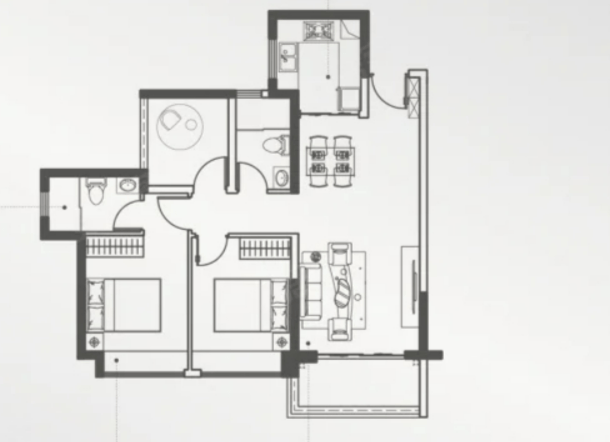 89㎡2+1房户型格局跟80㎡户型很相似,主要的区别在于朝向不同,89㎡2+1房户型是南向,通风和采光更佳,而且还做到了双卫,居住的舒适度会更好。