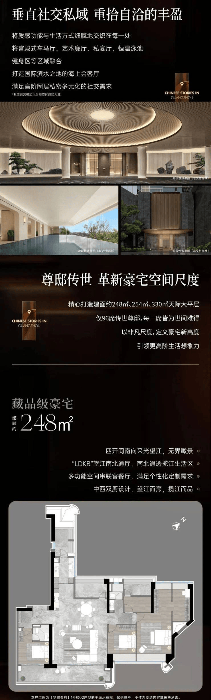 项目坚守纯顶奢改善定位,主打248-330㎡阔境大平层,涵盖248㎡、254㎡、330㎡多个户型,全盘仅96套,极致纯粹的户型布局,保障圈层的同质性,精准适配数字经济精英、多人口高阶家庭与圈层社交需求[2]。户型定价贴合顶奢定位,聚焦高净值人群,凭借稀缺性与产品力,成为广州顶奢楼市的稀缺标杆[4]。