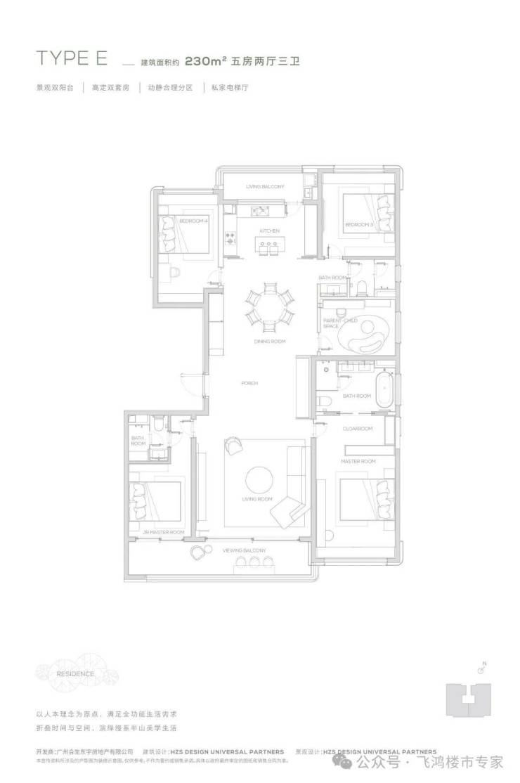 230平方米的五房户型是项目的明星产品。它采用“超级四叶草”布局,四个卧室如叶片般分布于户型四角,动线独立互不交叉,确保每位家庭成员享有私谧的休憩领地。