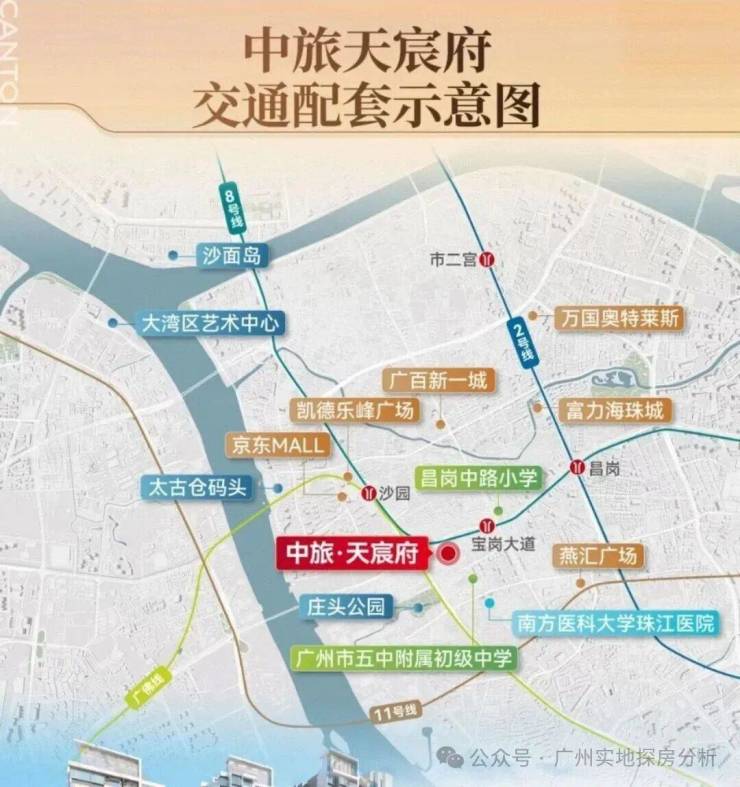 项目紧邻地铁8号线宝岗大道站,步行约150-200米,且可便捷换乘广佛线沙园站800米、2号线,通达荔湾、珠江新城等核心区域,适合依赖地铁通勤的居民。下楼即享多达20条公交线路车站,迅达全城。自驾的话,出门就是昌岗中路,周边还有宝岗大道、工业大道、东晓路等干线。