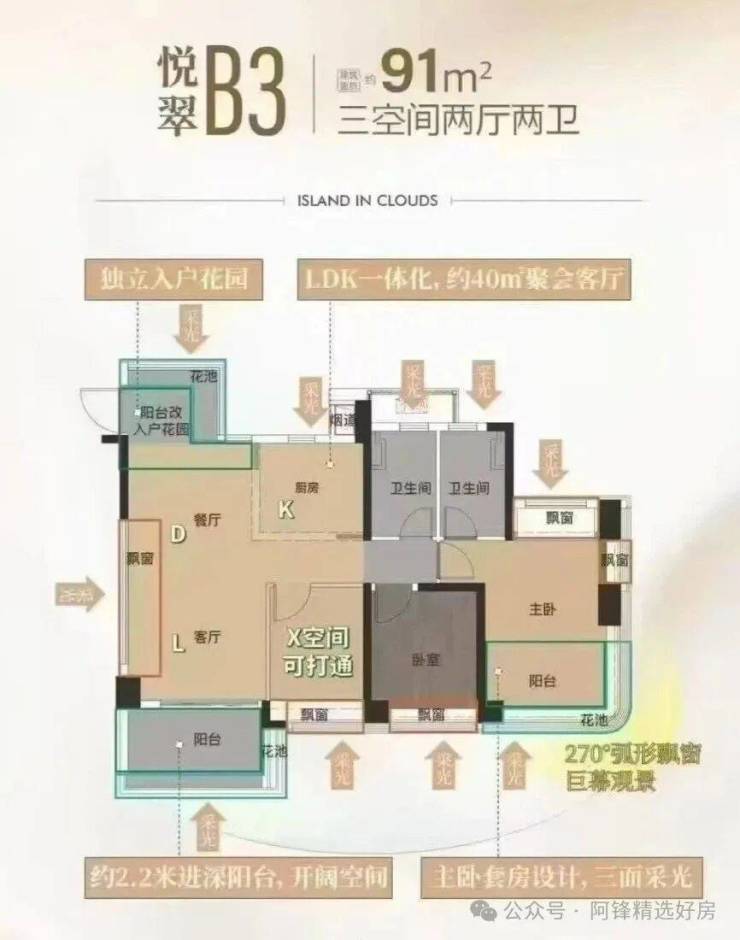 据悉,项目户型实用率约110%,设计细节方面,主卧做了一个弧形飘窗,相较于直角飘窗,颜值、视觉效果更佳,自然成本也更高。