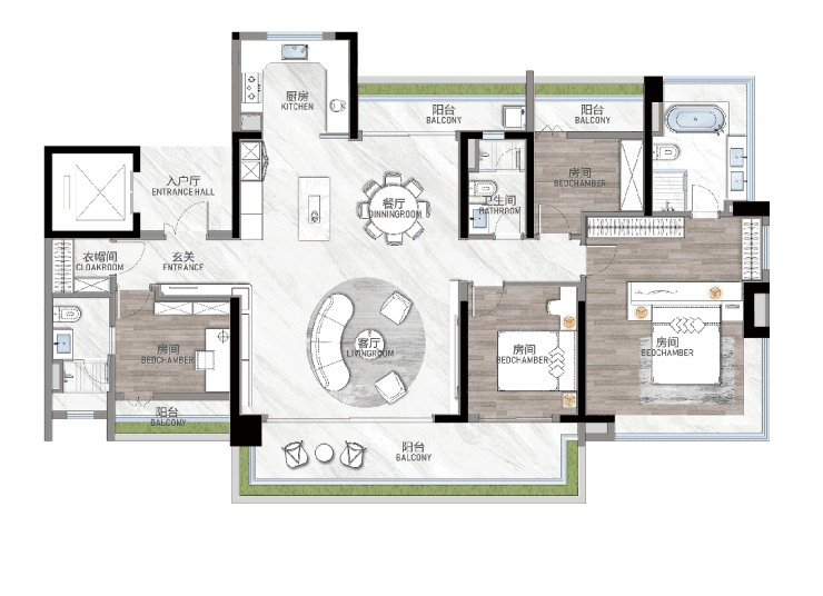 建面约115㎡四房户型,带有独立入户玄关,公共卫生间也设置在入户处,每天回家第一件事就能清洁消毒,将灰尘与细菌隔绝于室内。