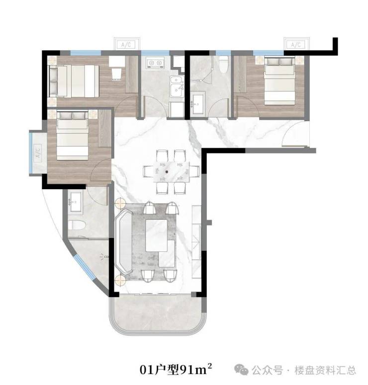 豪华精装交付建筑面积约 78㎡-86㎡-91㎡-101㎡-110㎡二至三房,全新住宅现楼,豪华装修交付,灵动空间设计,合理布局用心打磨每处细节,让生活变成一种享受01户型:约91㎡,三房两厅两卫带主套