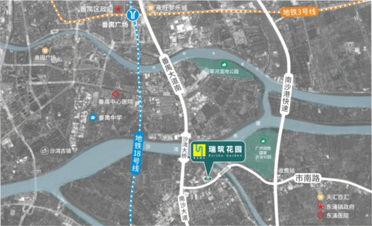 •18号线高速地铁最快18分钟直达珠江新城。22号线高速地铁2站12分钟即达广州南站,可通达全国高铁枢纽。3号线轻松连通长隆、万博、海珠、主城CBD。