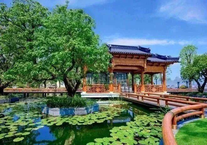 以水为核心,以约200多棵高大乔木、约29组富贵绿石及英石为主要景观,大量荷花等水生植物作为衬托,园林和建筑融合得美轮美奂