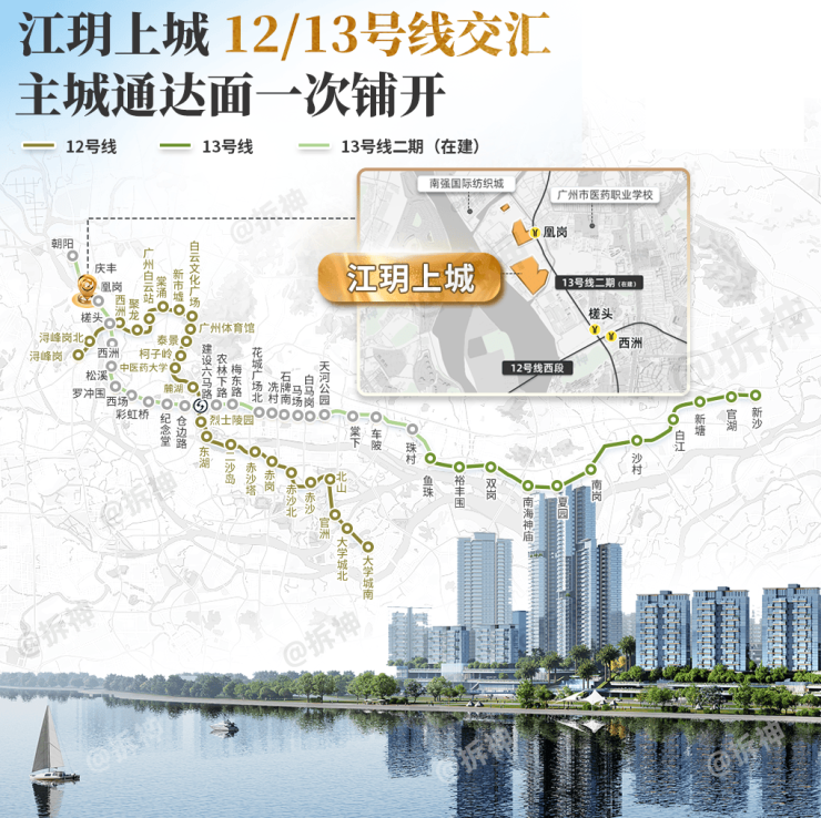 项目交通是一大亮点,出门约20米抵达13号线二期凰岗站(预计明年下半年开通),约15分钟到荔湾彩虹桥站,约30分钟到达花城广场北站,步行约700米到已开通的12号线西洲站,未来还有广佛8号线,可实现3条线同站换乘,未来地铁的通达度很高