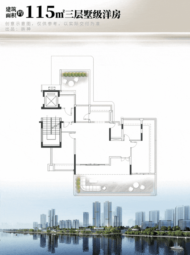 “玥境”为滨江别院小洋楼,主打113-124㎡低密叠院,最大亮点是超高赠送率,1F、2F户型赠送私属花园,3F赠送超大景观露台,4F复式设计,赠送顶层天台。