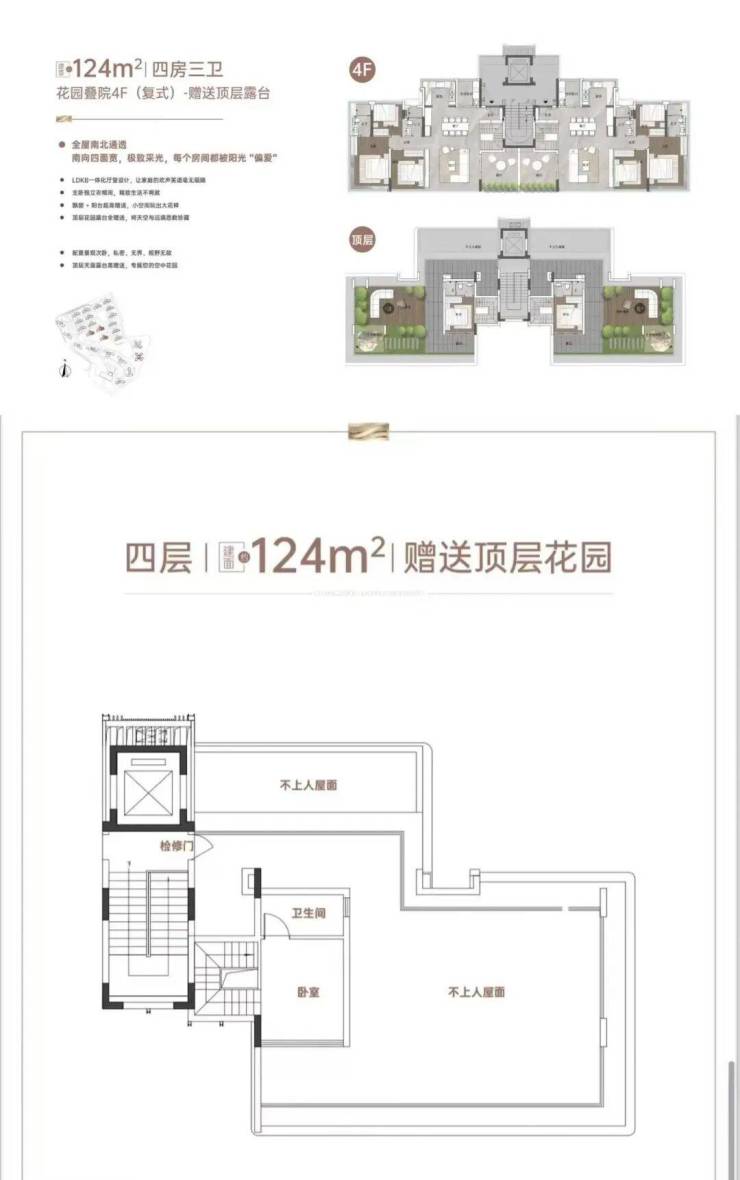 这是最接近墅级形态的户型,下层做了侧花园设计,顶层的天面露台全赠送,实现了约242%的使用率