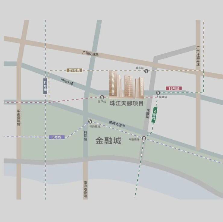 ⭐3条主干道中山大道丨黄埔大道丨科韵路⭐4条城市高速广州环城高速丨华南快速干线丨广园快速路丨南沙港快速⭐5条地铁线环绕4号线丨5号线丨11号线丨13号线丨21号线⭐20万㎡金融城站交通枢纽🚆整合广州两大重要交通枢纽——广州南站、广州白云机场。从金融城站到广州南站仅需10分钟,到白云机场仅需20分钟🛫金融城专属值机大厅,方便旅客提前办理值机手续,出行无缝连接;🚇容纳4地铁(4、5、13、25号线)+3新型交通线+1城轨(广佛环线),一站即可通全城!