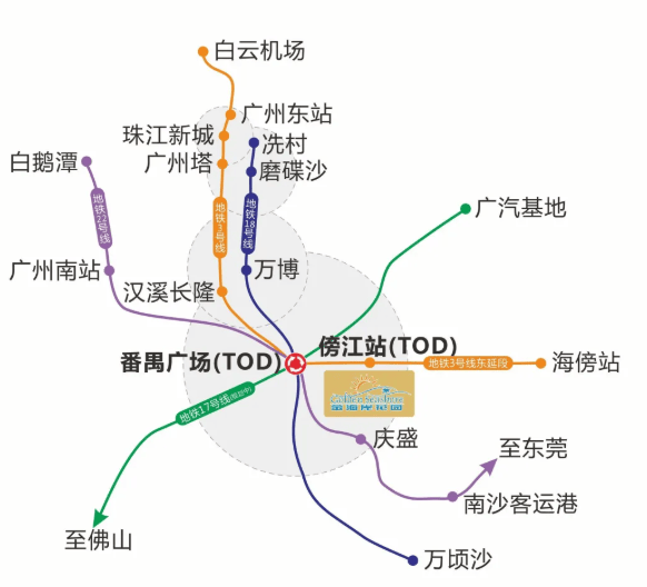 番禺广场板块被定位为“番禺新中心”,融合了TOD复合型城市发展模式,汇聚了立体交通、中央公园、综合商场等优质资源。通过傍江TOD与番禺广场TOD双子星格局,以及未来规划中的地铁线路,进一步提升了区域的交通枢纽地位,正朝着成为番禺版“花城广场”的目标迈进。