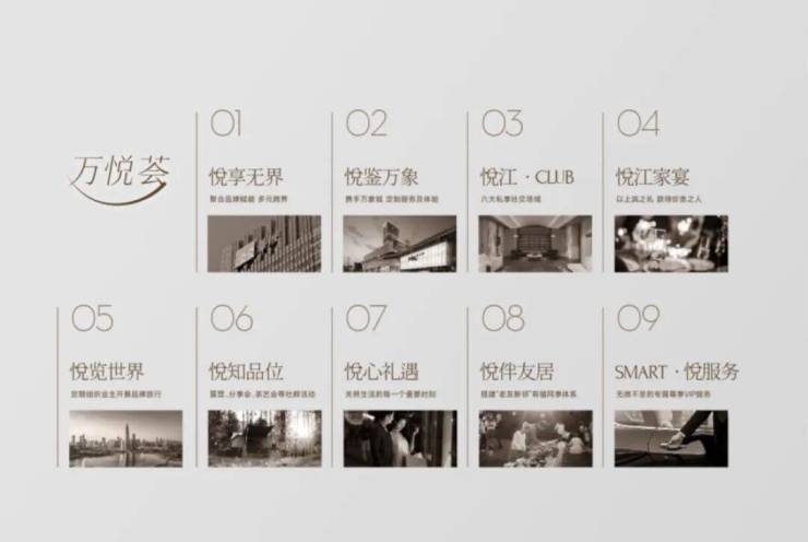 「万悦荟」整合多元业务领域,联手行业领先国际品牌,为业主带来系统化、定制化的全新滨江万象生活方式,包括:悦享无界、悦鉴万象、悦江·CLUB、悦江家宴、悦览世界、悦知品位、悦心礼遇、悦伴友居、SMART·悦服务9大权益。