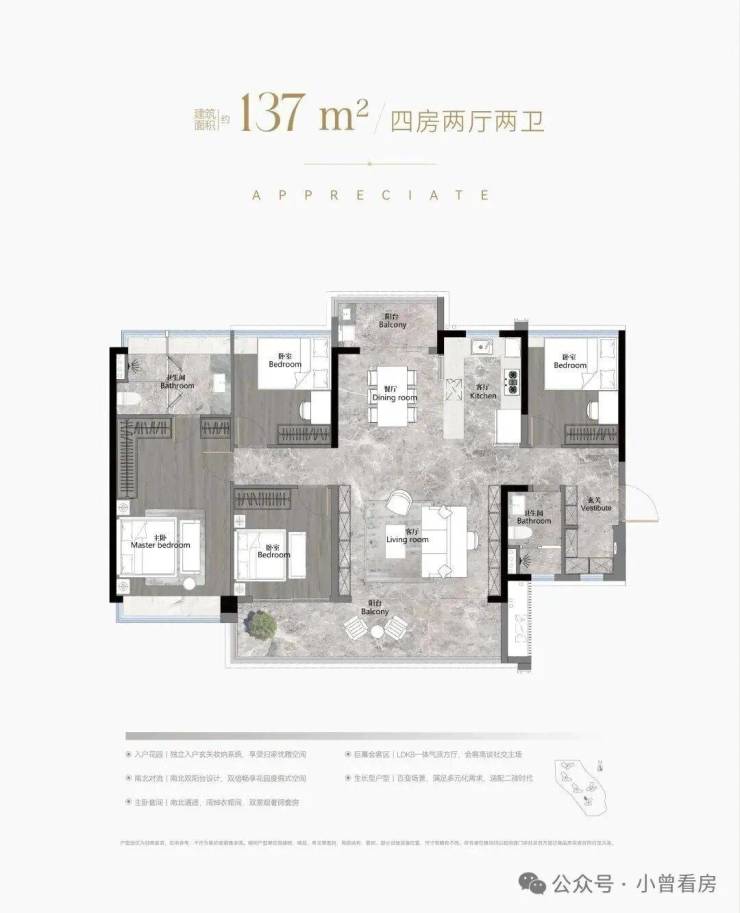建面137平四房两卫,带入户花园,南北对流,大客厅+LKDB设计,主卧套房,同样也可以对流。
