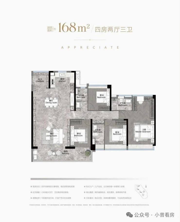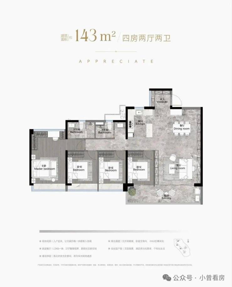 建面168平四房三卫,放大版的142平,做了双主套,适合三代同堂家庭,单边位,南北对流采光通风都非常好,约40平的大房厅,景观阳台开间约8.2米.