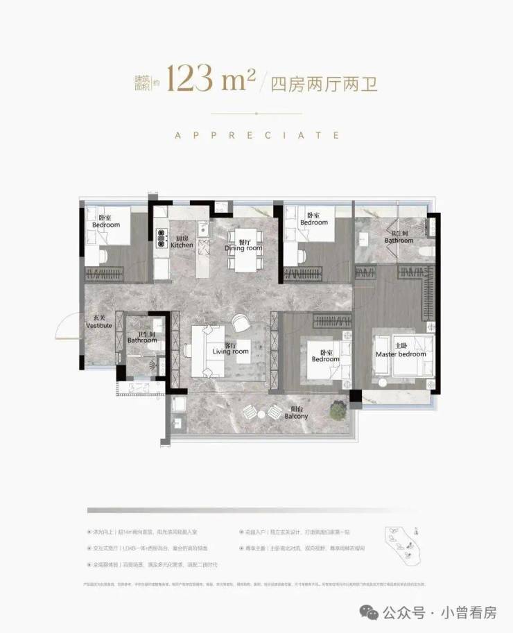 建面123平四房两卫,南北对流户型,LDKB一体化设计,约7米长景观阳台,主卧设置L型衣帽间,三个次卧差不多大小,转角玄关用作收纳。