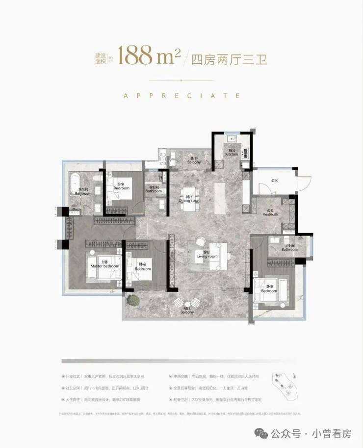 建面188平四房三卫,据说使用率超110%,双主套分居两侧,三代同堂的话,可以很好地避免两代人不同的休息时间干扰互相,入户独立玄关为还有宽裕的储蓄空间,能安置酒柜等,更有南北对流双阳台+中西双厨,主卧超宽三面采光等,不愧是终极改善不二之选,9米长跑道阳台,约34平豪华主卧,270度环幕飘窗