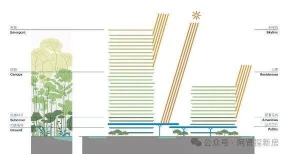 设计将地面层进行抬升,创造出一组景观平台,在为下方行人提供遮荫步行路径的同时,还增加了额外的花园和室外空间,并提供了雨水收集的功能。设计理念旨在打造多层次的室外体验,覆盖了从地面层行人的沉浸式视角,近地面的花园平台层和顶部独特的户外空间。