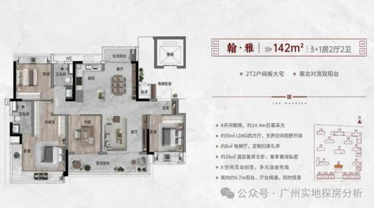 142m² 3+1房2卫,南北对流双阳台 | 4开间朝南,约14.4米全面屏采光 |约28㎡酒店套房主卧。