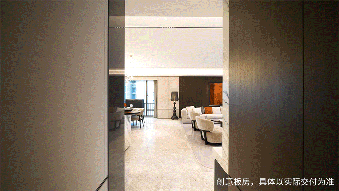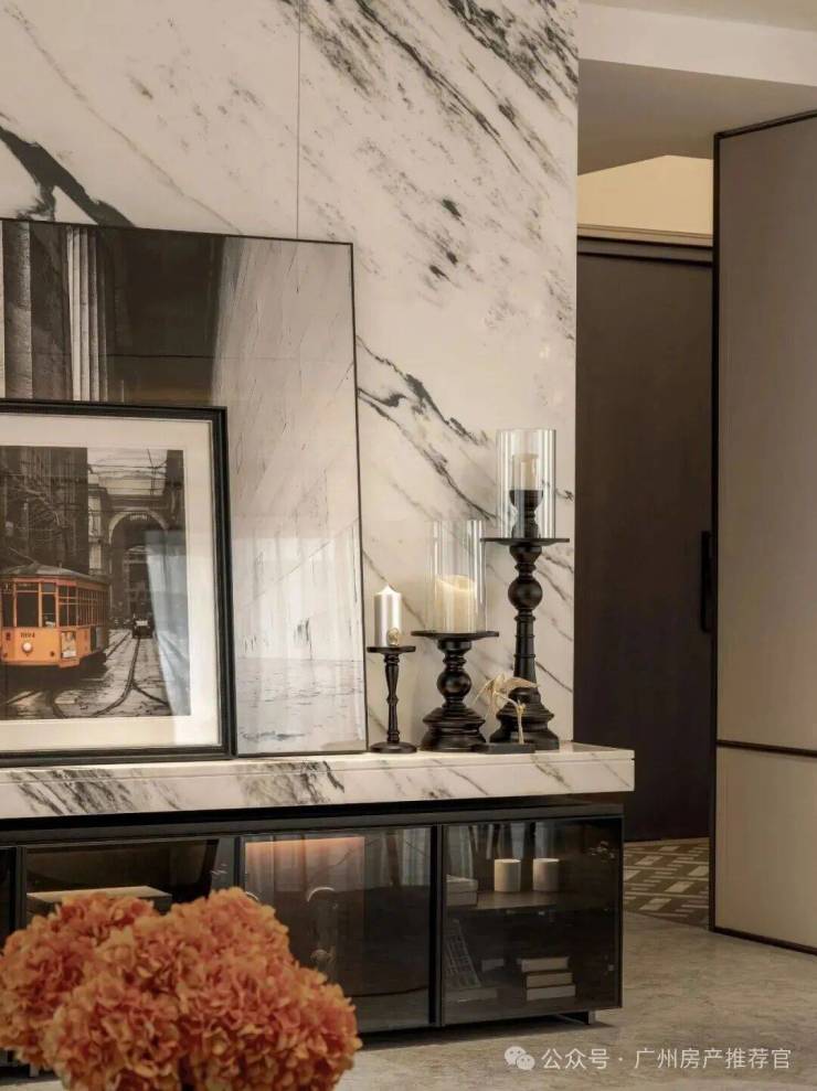 步入精装大堂,温润石材与珍稀的鱼肚金奢石背景墙辉映,艺术天花与隐藏光带营造出酒店式的归家仪式;电梯轿厢内的编织皮革、镶嵌于威尼斯棕奢石之上的悦系专属标识入户门牌,无不于细微处彰显高定美学与家的温度。