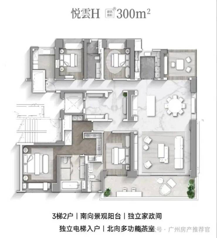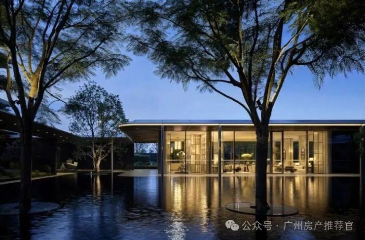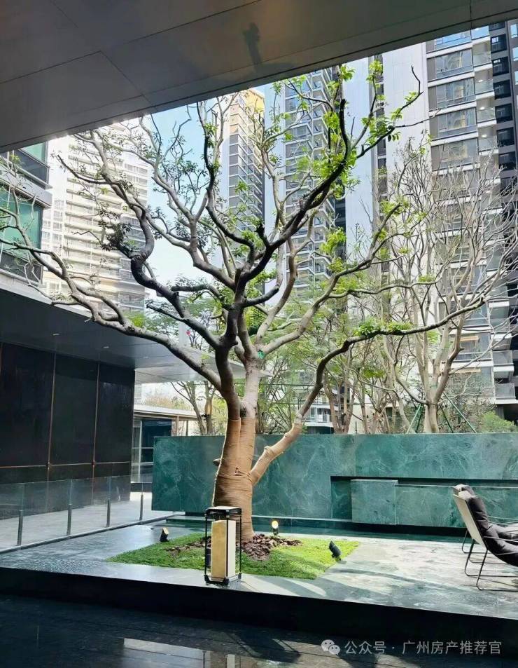 这场旅程始于园区入口——两棵超50年树龄的全冠罗汉松,以苍劲姿态守护家宅祥瑞;穿过蕴含正能量寓意的白水晶照壁,步入酒店式迎宾前厅,一株硕果累累的古桩孤植铁冬青,静候家人归来;信步而至的镜面水院,六棵凤凰木阵列水中,取意「有凤来仪,筑巢引栖」;此后,再经由作为社区客厅的悦仕会所与绿意盎然的中央园林,最终抵达静谧尊崇的楼栋大堂,完成一场从「城市菁英」到「家庭主人」的身份与心境转换。