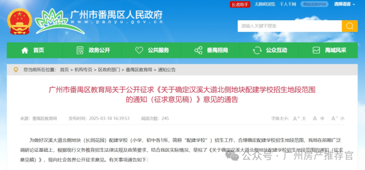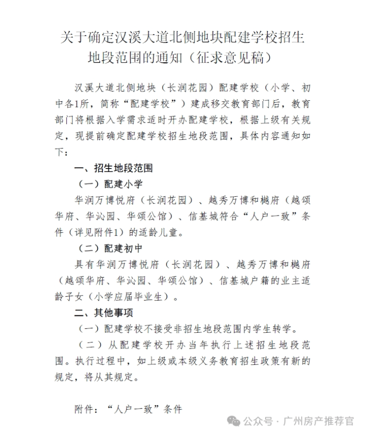 番禺区教育局正式发布《关于确定汉溪大道北侧地块配建学校招生地段范围的通知(征求意见稿)》的通告,明确提到: