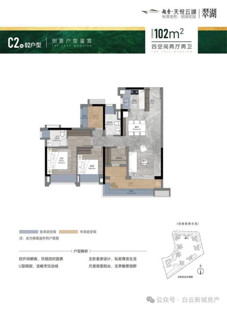 特点:四开间格局,干湿分离公卫,独立主卫,主卧带有景观飘窗,一线湖景。